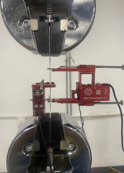 目前,一般的智能電子拉力機(jī)都配有計算機(jī)及配套軟件,可以實(shí)時顯示拉伸曲線,并能記錄實(shí)驗(yàn)過程中的檢測數(shù)據(jù)。在進(jìn)行拉伸彈性模量檢測時,一般還需配備引伸計。本文使用三晶電阻應(yīng)變片式引伸計來測量拉伸彈性模量的方法。