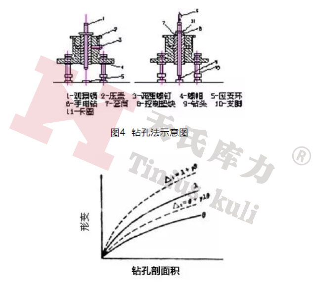 繪制這些數值與鉆孔剖面積的關系曲線,用作圖法求出曲線上任意一點的到處,表征延伸率與鉆孔剖面的變化率,然后代入相應的應力公式即可得到殘余應力值。