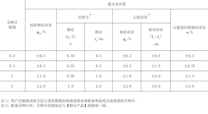 引伸計(jì)的標(biāo)距相對(duì)誤差、示值誤差、示值進(jìn)回程相對(duì)誤差、分辨力應(yīng)符合下表的規(guī)定。