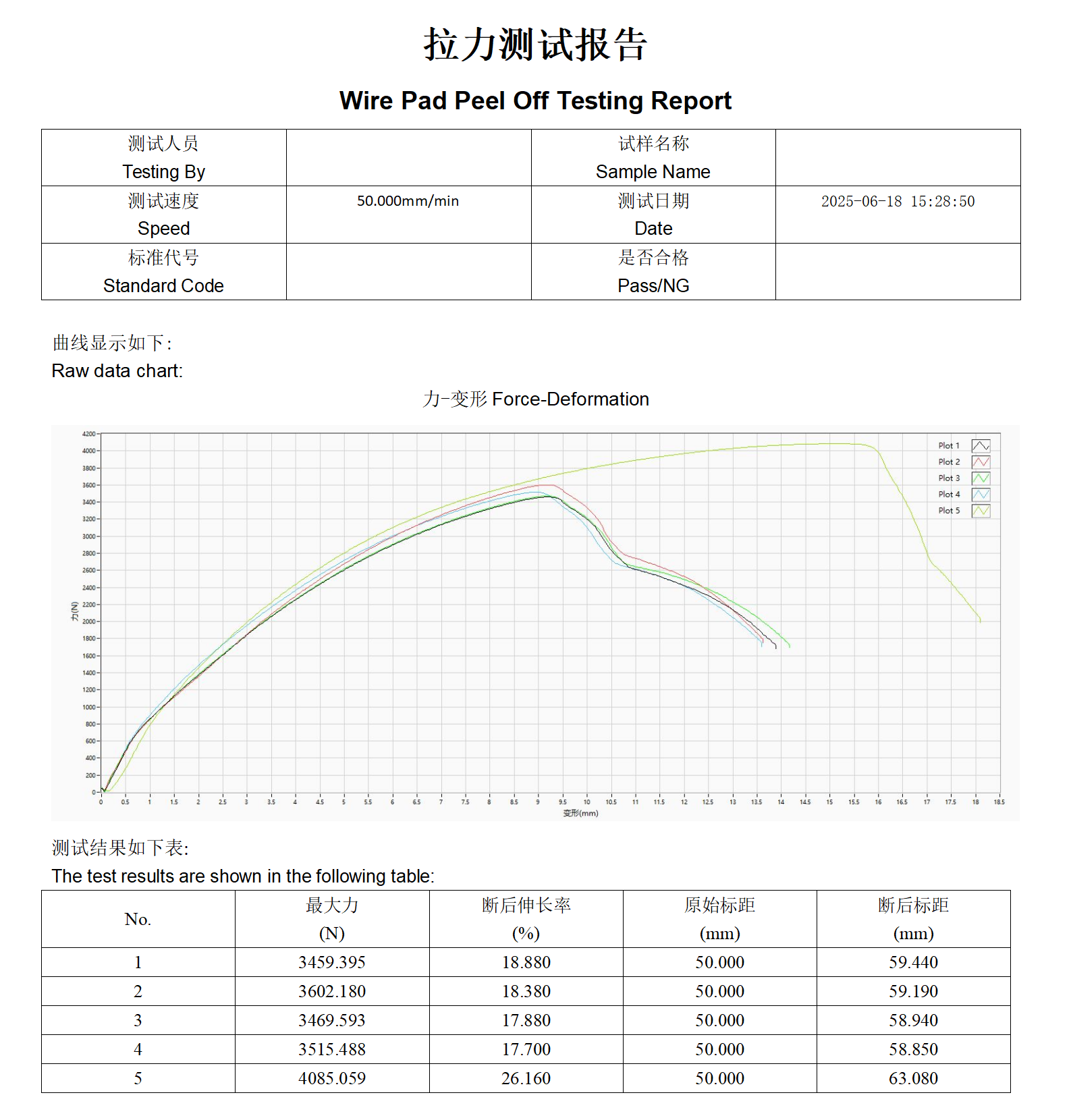 對比測試曲線與標準特征曲線:正常曲線應無劇烈抖動(排除打滑干擾),斷裂瞬間力值驟降。單組試驗至少重復3個有效試樣,數據偏差超過5%需復測。