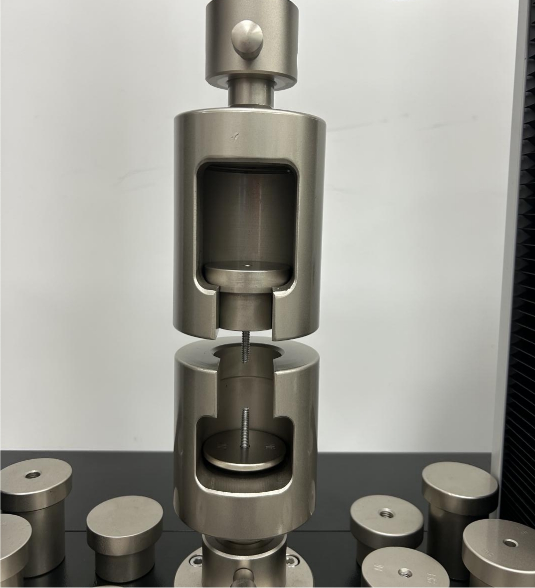 螺栓拉伸夾具: 專為螺栓、螺柱等試樣的軸向拉伸測試而設(shè)計。夾具由高強度合金鋼制成,通過一系列不同規(guī)格的套筒和墊塊組合,可適配多種螺栓頭部型式(如六角頭、內(nèi)六角頭)和螺紋直徑。其核心優(yōu)勢在于能夠?qū)⒗炝珳实貍鬟f至螺栓軸向,有效避免彎曲應(yīng)力,保證測試數(shù)據(jù)的準確性。