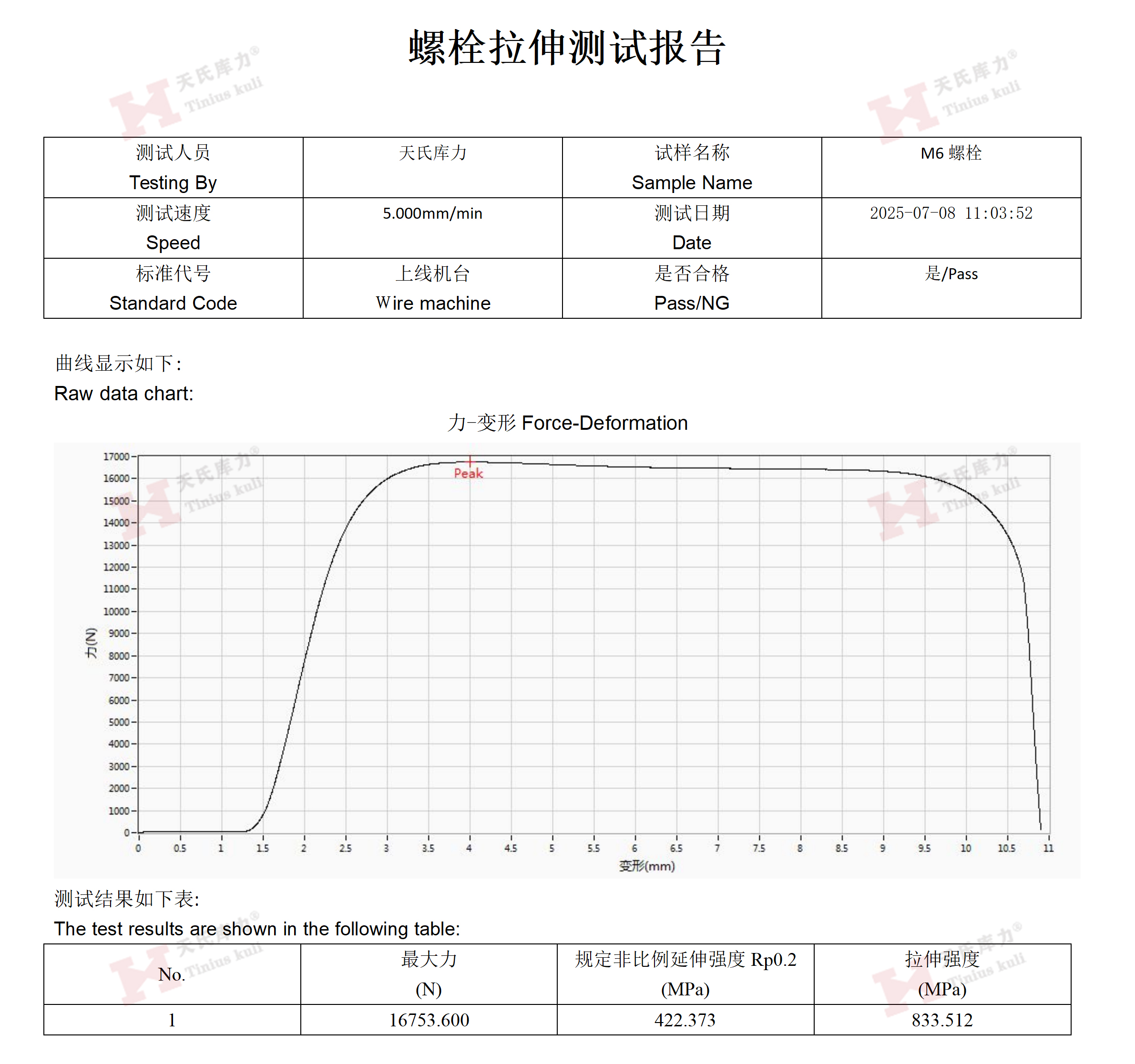 抗拉強度: 測量螺栓在斷裂前所能承受的最大應(yīng)力值。這是螺栓極限承載能力的體現(xiàn),為設(shè)計提供重要的安全余量依據(jù)。